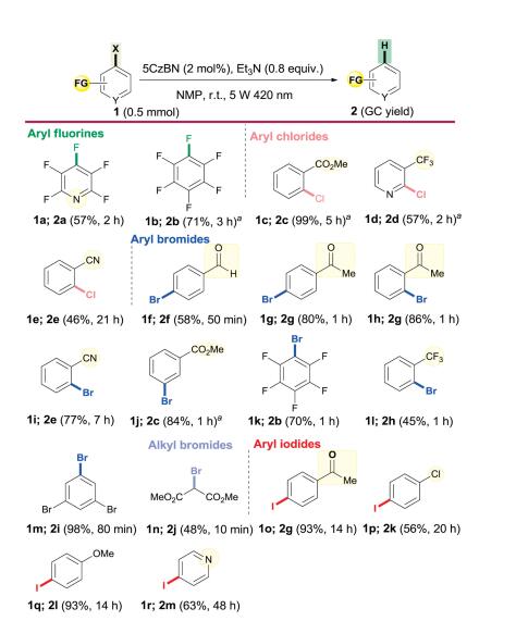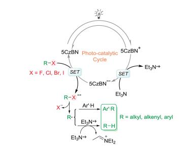 Tailorable carbazolyl cyanobenzene-based photocatalysts for visible light-induced reduction of aryl halides