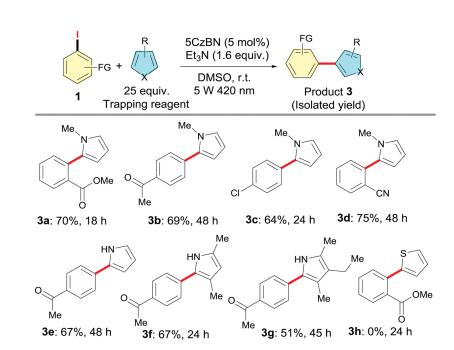 Next, we turned our efforts to utilize the aryl radicals generated in situ from the photoreduction of aryl halides for arylation reactions. N-Heterocyclic pyrroles might suit our need because of their high affinity for radical species [16]. As expected, when the reaction was carried out in the presence of an excess amount of 1- methyl-1H-pyrrole in MSO, the corresponding arylation product 3a was obtained in a yield of 70%. As shown in Scheme 3, a variety of arylation products 3a-3g were obtained at a moderate to good yields by varying the different trapping groups. unctional groups such as cyano, ester, and ketone can also be well tolerant under the mild arylation conditions. Unfortunately, when the thiophene was used to instead of pyrrole, no product 3h was observed.
