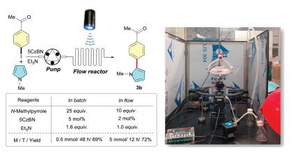 Because of the light attenuation effect through absorbing media as dictated by the Bouguer-Lambert-Beer law, the scaling up of photochemical transformations in batch is greatly limited. However, the photocatalytic continuous-flow technology shows great potential to overcome this limitation [17]. To this end, we scaled up the important arylation reactions by photocatalytic continuous-flow technology. As showed in Scheme 3, 0.5 mmol of p-bromoacetophenone were converted into target product 3b in 69% yield within 48 h under batch conditions. nterestingly, a 5 mmol scale reaction performed by continuous-flow setup was smoothly completed in much shorter time (12 h) with even less amount of catalyst and trapping reagent, affording the corresponding product 3b in 72% yield (Scheme 4).