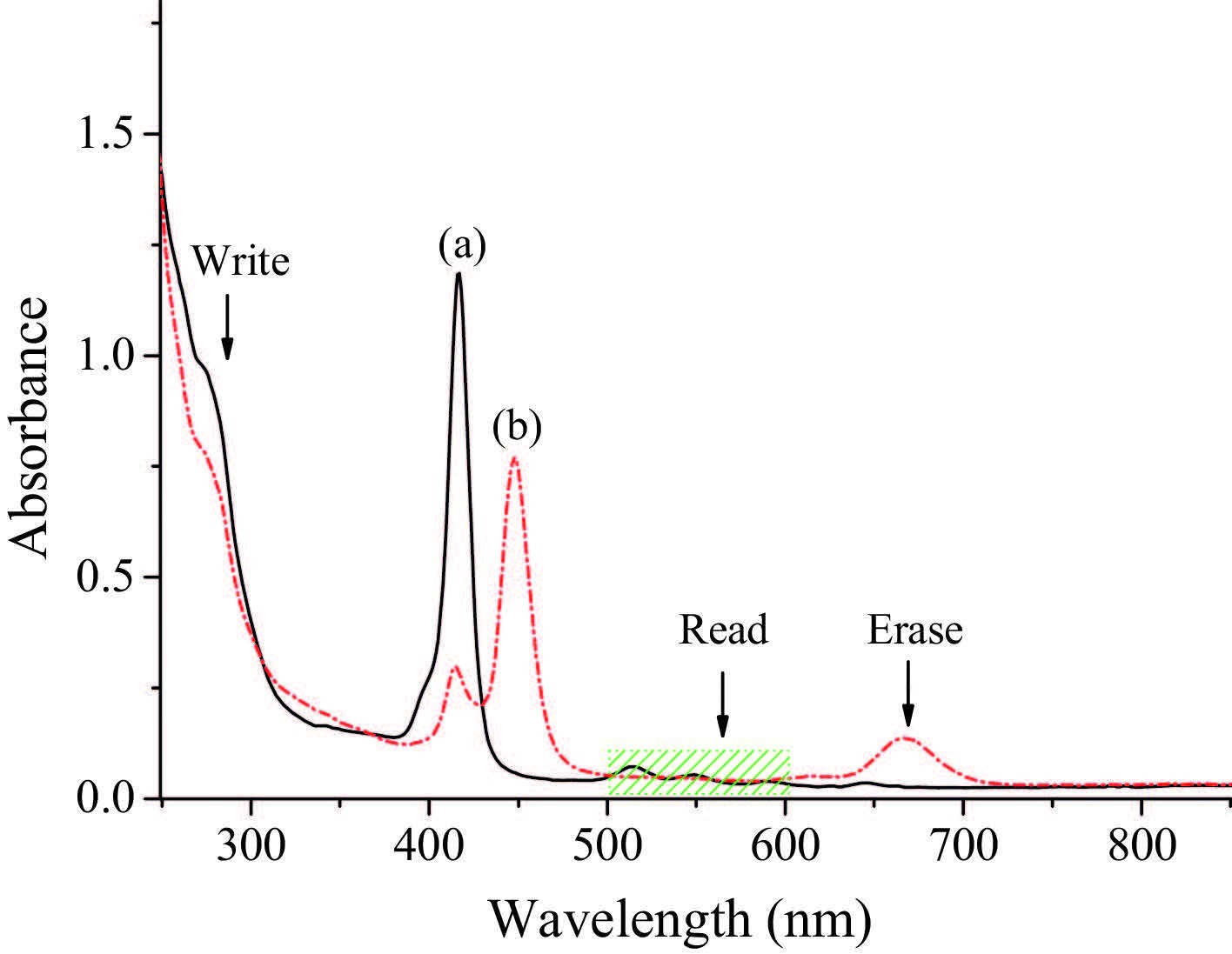 Photochromism is defined as reversible chemical transition of a molecule with irradiation upon appropriate light. Two isomers show different structures and absorption spectra. Many kinds of photochromic compounds have been reported in the past decades, including diarylethenes [8], spiropyrans [9], fulguides [10], stilbenes [11], azobenzenes [12], etc. Among above, the fulgides always exhibit favorable thermal stability, high fatigue resistance and reliable phohochromic reactivity in both solution and even solid state. The fulgides could be used to store binary information by ultraviolet and visible light for the application for photoinformation storage due to the excellent photochromic characteristics. However, two major problems should be resolved for the application while reading the stored data. Firstly, the exciting light of readout device would not be absorbed by either the open or the closed forms to avoid data damage in reading process. Secondly, the readout is based on the emissive luminescence which should not cause the photochemical reaction. Obviously, the direct method to resolve the dilemma is to separate the excitation and emission wavelengths from the absorption wavelengths of both isomers. In this article, the porphyrin was used as the luminescent center of fulgide and the method for nondestructive readout will be described in details.
