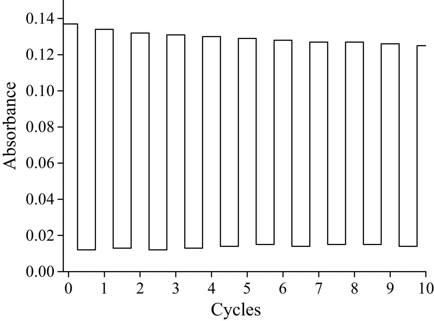图 2 Photocycling of the FUL-TPP in solution of CH2Cl2. The absorbance at l = 667 nm measured for 5 s after each switching operation are shown: after UV irradiation for 2 min (high value) and after visible light irradiation for 20 min (low value).Figure 2. Photocycling of the FUL-TPP in solution of CH2Cl2. The absorbance at l = 667 nm measured for 5 s after each switching operation are shown: after UV irradiation for 2 min (high value) and after visible light irradiation for 20 min (low value).图 1