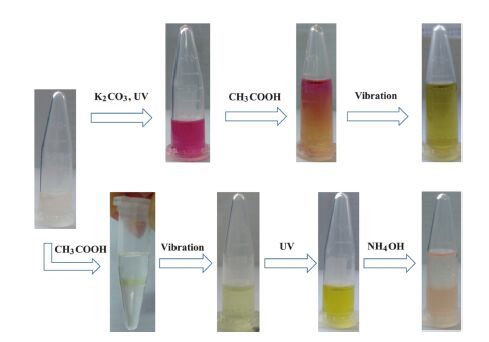 In a general way, the solutions of the open form of great majority of fulgides are colorless or yellow, and the closed forms are usually dark colored. In this work, the open form of the solution of CH2Cl2 of FUL-TPP is light red that is because the porphyrinic derivatives are generally close to red. However, the color of the closed-ring form is green that is different from our prediction. In order to investigate the reason of the distinction, we designed the procedures as follows. Firstly, we prepared a series of solutions of CH2Cl2, THF, EtOAc and DMSO of FUL-TPP in about 10~7mol/L. They are all nearly colorless but with a little bit red. After irradiation with light at 254 nm for 20 min, they all turned dark red except the solution of CH2Cl2. We predict that the reason may be the generation of acid by the irradiation upon UV light on CH2Cl2. In order to confirm our prediction, double solutions of CH2Cl2 was prepared and one of them was irradiated upon the UV light followed the addition of K2CO3 powder. To the other one, equal quantity of acetic acid was added carefully and the interface of the two solutions turned green. After vibration, the solutions blend to one phase and show green, then were moved to the UV light. After irradiation for 20 min, the first one with K2CO3 turned dark red and the second one with CH3COOH turned dark green. To the first one, the equal quality of glacial acetic acid was added, after vibration, the solution turned green. The second solution turned red after addition of ammonium hydroxide. The result indicates that the solution of CH2Cl2 of FUL-TPP shows red in acid and green in basic condition. The irradiation of UV light makes it turned from light to dark and blenched in visible light (Fig. 4).