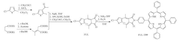 To a stirred solution of isopropylidene diethyl succinate (3.0 g, 14.0 mmol) in tetrahydrofuran (50 mL) at 0 ℃ under nitrogen was added NaH (0.8 g, 20.0 mmol) rapidly. The resulting mixture was stirred for 30 min. The solution of 5-chloro-2-methyl-3-acet- ylthiophene (1.74 g, 10.0 mmol) in THF (20 mL) was added and the mixture was allowed to warm to room temperature. After 8 h, the solvent was removed. The resulting brown syrup was dissolved in ethyl acetate (50 mL) and acidified with conc. HCl (10 mL). The reaction mixture was extracted with ethyl acetate (2 × 20 mL). The combined organic layers were dried (MgSO4) and filtered, and solvent was removed in vacuum. The semi-ester product was dissolved in 10% KOH-alcohol liquor (50 mL) and the solution refluxed for 2 h. Cold it to room temperature and acidified with conc. HCl (10 mL). The resulting mixture was extracted with ethyl acetate (2 × 20 mL). The combined organic layers were dried (MgSO4) and filtered, and solvent was removed in vacuum. The residue was dissolved in anhydrous dichloromethane and acet- ylchloride (2 mL) was added at ice-cold bath. After 8 h, the solvent was removed and afforded the target compound. Purification by chromatography on silica gel with petroleum ether: EtOAc (1:10) to yield fulgide 1.98 g (66.9%) as yellow solid. To a stirred solution of anhydrous CH2Cl2 of fulgide (30 mg, 0.1 mmol) and NH2-TPP (70 mg, 0.11 mmol), 1 mL of Et3N was added dropwise and the mixture was refluxed for 5 h. Cool it down to room temperature, and 2 mol/L HCl was added to the pH 4〜5. The resulting mixture was extracted with CH2Cl2 (2 × 20 mL) and washed with water (3 × 20 mL) to the pH 7. The combined organic layers were dried (MgSO4) and filtered, and solvent was removed in vacuum to yield 51 mg (59.2%) as amaranthine solid. The solid was dissolved in CH2Cl2 (15 mL) and 2 mL trifluoroacetic anhyride added. The solution turned red to green rapidly. The mixtures were stirred at room temperature for another 3 h. After reaction, the solution was removed in vacuum and the residue was washed with saturated NaHCO3 aqueous solution, extracted with CH2Cl2, dried with MgSO4 and filtered. The solution was removed in vacuum. Purification by chromatography on silica gel with petroleum ether: CH2Cl2 (5: 1) to yield 48 mg (51.6%) as violet solid. mp: > 250 ℃.1H NMR (CDCl3, 500 MHz): d 9.04 (s, 2H), 8.78 (s, 6H), 8.41 (s, 2H), 7.92〜7.89 (m, 17H), 7.17 (s, 1H), 2.85 (s, 3H), 2.52 (s, 3H), 2.23 (s, 3H), 1.21 (s, 3H), -2.60 (s, 2H); 13C NMR (CDCl3, 127 MHz): d 167.6, 166.6, 166.1, 159.5, 146.8, 142.3, 137.0, 135.6, 134.4, 133.7, 132.0, 131.9, 131.0, 129.1, 128.6, 128.1, 127.9, 125.9, 124.3, 120.1, 119.7, 22.0, 21.8, 14.6; IR(KBr) n: 3455, 3369, 3315, 3052, 3023, 2918, 1812, 1616, 1596, 1510, 1470, 1440, 1349, 1279, 1176, 979, 796, 729, 698 cm-1; MS(ESI, m/z):908.24 [M + H]+.