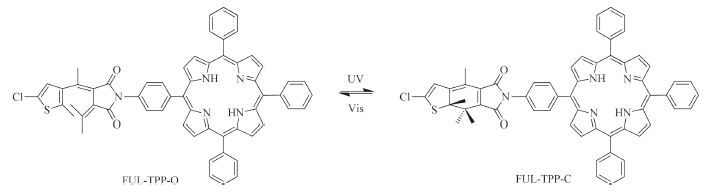 For the first time, the structure and isomerization of the FUL- TPP used in this work are shown in Scheme 1. The open form of FUL-TPP in CH2Cl2 has nearly no absorption band in the visible region. Upon irradiation with UV light (λ=254 nm), the pink solution turned kelly and a new absorption band appeared around 667 nm ranging from 637 nm to 714 nm. Another interesting phenomenon shown in Fig. 1 is that the absorption in Soret band of porphyrin red shift from 418 nm to 448 nm of FUL-TPP due to the increasing electron density from the gradual formation of the closed isomer. The green solution was bleached in a large extent after irradiation with visible light, and a small protuberance arises at nearly 273 nm. These ring closing and opening cycles were repeated at least 10 times (Fig. 2). Therefore, the FUL-TPP showed feasible reversible photochromic reaction (Scheme 2).