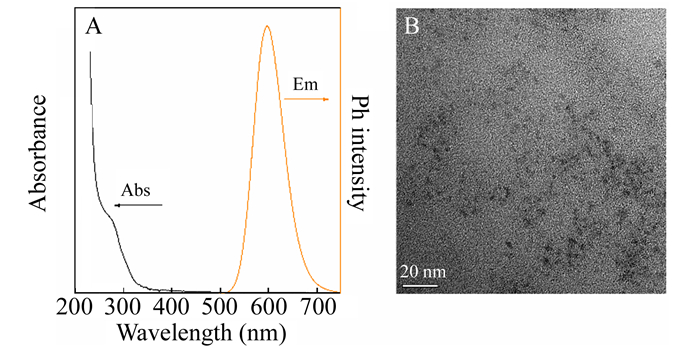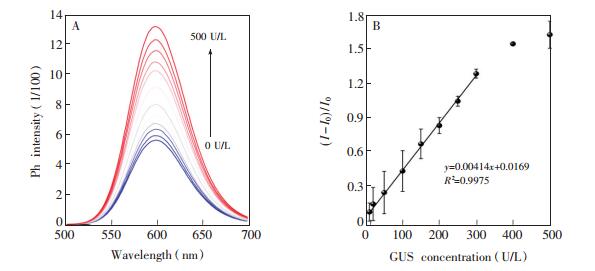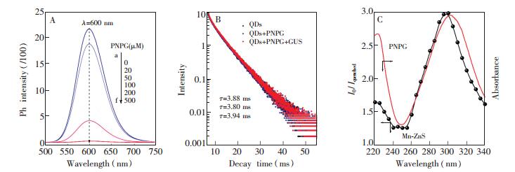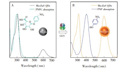 1. 引言β-葡萄糖醛酸酶(GUS)广泛存在于动植物与微生物中,它能够催化β-D-吡喃葡萄糖基底物水解为相关的糖苷配基和D-葡萄糖醛酸[1]。人体内β-葡萄糖醛酸酶水平的升高与一些癌症有关[2, 3],如结肠癌[4, 5]、肾癌[4]等。此外,由于β-葡萄糖醛酸酶是一种大肠杆菌的特异性酶,所以针对β-葡萄糖醛酸酶的分析所建立的大肠杆菌检测方法也有许多报道[6, 7]。目前,针对β-葡萄糖醛酸酶的检测的方法大多集中在比色法[5, 7]和基于有机荧光探针的化学传感法[8]。然而,比色法常受到基质干扰,导致β-葡萄糖醛酸酶的检测受到影响; 有机探针传感法所用底物的合成通常复杂且耗时。因此,发展简单有效的检测β-葡萄糖醛酸酶的方法非常重要。 内滤效应(IFE)作用机制是由于猝灭剂的吸收光谱与荧光团的激发光谱或发射光谱有重叠作用而引起的荧光猝灭。相比于传统的光物理过程,如共振能量转移[9]、电子转移[10]等,内滤效应过程无需考虑荧光物质与吸收物之间的距离,避免许多繁琐的标记,因此,内滤效应作为一种简单有效的荧光猝灭机制被广泛用于荧光传感分析[11, 12]。内滤效应作用的关键是使猝灭剂的吸收光谱与荧光团的激发光谱或发射光谱最大限度的重叠,从而引起荧光团最大限度的猝灭。由于传统的有机荧光染料的激发或发射光谱确定,很难有吸收物的吸收光谱与它们完全匹配,而量子点(QDs)由于其量子尺寸效应具有光谱可调的性质,近年来广泛用于基于内滤效应的荧光传感分析中[13, 14]。其中,基于荧光内滤效应进行生物酶的检测也有许多报道[15~17]。 本研究发现Mn-ZnS量子点的激发光谱与β-葡萄糖醛酸酶的特异性底物4-硝基苯-β-D-葡糖苷酸(PNPG)的吸收光谱有大幅重叠,而GUS催化分解的底物对硝基苯酚(PNP)的吸收光谱与该量子点的发射光谱无重叠,因此对该量子点磷光发射无影响。此外,Mn-ZnS QDs具有优异的室温磷光性质,可避免生物组织荧光背景感染,适用于生物样品分析[18]。本研究选用BSA包裹的Mn-ZnS量子点作为荧光剂,以GUS底物PNPG为吸收物,建立了一种基于内滤效应的简单、灵敏的磷光检测GUS的方法,并尝试用于大肠杆菌的检测。 2. 实验部分2.1 仪器与试剂F-7000荧光光谱仪(日本日立公司); Fluorolog-3荧光光谱仪与波长为280 nm的Spectral LED灯(Horiba Jobin Yvon公司); UV-1750紫外-可见分光光度计(日本岛津公司); Tecnai G2 F20 S-TWIN透射电子显微镜(美国FEI公司); 超纯水机(成都品诚科技有限公司)。 β-葡萄糖醛酸酶(GUS)、4-硝基苯-β-D-葡糖苷酸(PNPG)、牛血清蛋白(BSA)、谷氨酸、组氨酸、缬氨酸、异亮氨酸、天冬酰胺、苏氨酸、天门冬氨酸、丙氨酸、半胱氨酸、谷胱甘肽(西格玛奥德里奇(上海)贸易有限公司); 葡萄糖、抗坏血酸、KCl、CaCl2、MgCl2、FeCl3、CuCl2·2H2O、Mn(Ac)2·4H2O、Zn(Ac)2·7H2O、Na2S·9H2O(成都科龙化学品有限公司); Na2HPO4、NaH2PO4、NaOH(上海阿拉丁化学试剂有限公司); LB肉汤培养基(鹏世达实验品有限公司)。所用试剂均为分析纯。大肠杆菌(O157:H7)菌种由本校生命科学学院实验室提供。 2.2 BSA包裹的Mn-ZnS量子点的制备采用文献[19]的方法,在室温中性条件下快速合成Mn掺杂的ZnS量子点。具体步骤如下:在288 μL超纯水中依次加入40 μL 10 mg/mL BSA溶液,40 μL 1 mmol/L Mn(Ac)2溶液,38 μL 20 mmol/L Zn(Ac)2溶液和50 μL Tris-HCl缓冲溶液(pH 7.0),静置5 min。涡旋振荡下,向上述溶液快速加入34 μL 20 mmol/L Na2S溶液,即可得到具有磷光的BSA包裹的Mn-ZnS量子点。 2.3 内滤效应检测β-葡萄糖醛酸酶向2 mL离心管中加入200 μL PBS缓冲溶液(pH 6.8),随后加入100 μL 1 mmol/L PNPG,再加入相应量的超纯水与一系列浓度的β-葡萄糖醛酸酶,终体积为1 mL,摇匀。将上述溶液放置37℃水浴锅中反应5 h,随后依次加入50 μL 0.5 mol/L NaOH和50 μL Mn-ZnS量子点,混匀后在300 nm激发光测定磷光。 2.4 大肠杆菌的培养与检测称取0.6 g LB肉汤培养基溶于装有30 mL超纯水的锥形瓶中,高温灭菌。待培养基冷却后,用灭菌枪头吸取100 μL大肠杆菌菌种液接种,37℃恒温摇床上振荡培养12 h。吸取1 mL菌液,离心,用无菌水洗涤后注入装有9 mL无菌水试管中,制成10-1倍菌悬液。按上述操作制备10倍递增的菌悬液,取100 μL 10-6倍菌悬液涂布平板计数,平行样做3组。 吸取上述不同浓度菌悬液与0.1 mmol/L底物PNPG在37℃水浴反应5 h,随后依次加入50 μL 0.5 mol/L NaOH和50 μL Mn-ZnS量子点,混匀后在300 nm激发光下进行室温磷光强度测定。 3. 结果与讨论3.1 Mn-ZnS量子点表征如图 1A所示,Mn-ZnS量子点在250~310 nm处有较强的宽紫外可见吸收带,在300 nm激发波长下,此量子点有窄而强的磷光发射光谱,在600 nm处磷光发射最强。由高分辨透射电镜图(图 1B)可见,BSA包裹的Mn-ZnS量子点为球状,且单分散性良好。此量子点表征结果与文献[18]的结果相符。 图 1 图 1. (A) Mn-ZnS量子点的紫外可见吸收与磷光发射光谱; (B)Mn-ZnS量子点的透射电镜图Figure 1. (A) UV-Vis spectra and phosphorescent emission of Mn-ZnS quantum dots (QDs); (B) transmission electron microscopic (TEM) image of Mn-ZnS QDs 图 1. (A) Mn-ZnS量子点的紫外可见吸收与磷光发射光谱; (B)Mn-ZnS量子点的透射电镜图Figure 1. (A) UV-Vis spectra and phosphorescent emission of Mn-ZnS quantum dots (QDs); (B) transmission electron microscopic (TEM) image of Mn-ZnS QDs3.2 探索Mn-ZnS量子点用于IFE检测GUS可行性本研究选择BSA包裹的Mn-ZnS量子点进行磷光内滤传感,用于检测β-葡萄糖醛酸酶。控制实验表明,GUS的紫外-可见吸收与量