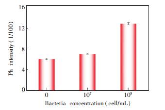 (%)谷氨酸 Glutamic acid 100 μmol/L 5.1 组氨酸 Histidine 100 μmol/L 1.6 缬氨酸 Valine 100 μmol/L -5.3 异亮氨酸 Isoleucine 100 μmol/L -3.3 天冬酰胺 Asparagine 100 μmol/L -3.9 苏氨酸 Threonine 100 μmol/L 1.2 天门冬氨酸 Arginine 100 μmol/L -5.1 丙氨酸 Alanine 50 μmol/L -8.2 半胱氨酸 L-cysteine 20 μmol/L -1.3 葡萄糖 Glucose 10 mmol/L -1.9 谷胱甘肽 GSH 1 μmol/L 1.1 抗坏血酸 Ascorbic acid 1 μmol/L -3.2 K+ 1 mmol/L -0.20 Ca2+ 100 μmol/L 5.6 Mg2+ 50 μmol/L -1.6 Fe3+ 500 nmol/L 0.06 Zn2+ 2 μmol/L 0.38 Mn2+ 500 nmol/L 4.6 Cu2+ 200 nmol/L -26.0 3.7 大肠杆菌的测定微生物中,β-葡萄糖醛酸酶是一种大肠杆菌的特异性酶,因此针对GUS的分析所建立的大肠杆菌检测方法已有许多报道[6, 7]。本研究利用大肠杆菌该特性,将Mn-ZnS量子点-PNPG磷光内滤体系用于大肠杆菌浓度的检测,有效地避免了生物荧光背景干扰。内滤体系中不同浓度大肠杆菌所产生的磷光信号响应见图 6。大肠杆菌细胞浓度为107 cell/mL时,体系的磷光信号明显增强,与空白样品可明显区分; 当大肠杆菌浓度增长至108 cell/mL,体系磷光信号大幅度增长,这是由于体系中分泌的大量GUS导致的。上述结果表明,本方法可用于大肠杆菌的的检测,证明了所合成的磷光探针用于大肠杆菌检测的可行性。 图 64. 结论本研究建立了一种基于Mn-ZnS量子点-PNPG磷光内滤体系检测β-葡萄糖醛酸酶方法。本方法无需标记,操作简单,可用于大肠杆菌的检测,并有望用于实际样品分析。