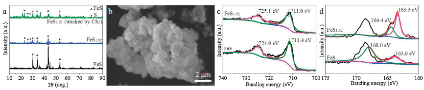 In mechanical milling synthesis, FeS and S powders were mixed together by different ratios. The ball milling process with intensive fracturing and grinding would promote the solid state reaction of FeS with sulfur, which lead to the formation of FeS1.92 alloy phase [33, 34]. The X-ray diffraction (XRD) pattern of as synthesized sample (Fig. 1a) shows the peaks related to FeS, S and FeS1.92. The peak intensity of S becomes stronger with increasing the molar ratios of S/FeS (Fig. S1 in Supporting information). This XRD results suggest that the mechanochemical synthesis can obtain the FeS1.92 with some FeS and S remained. In order to verify the chemical structures of FeS1.92, we then washed the sample with CS2 to remove the free sulfur. The XRD peaks of washed FeS1.92 exhibit characteristic FeS1.92 peaks. The scanning electron microscope (SEM) image of FeS1.92 sample shows a floccus morphology, which is related to the mixture of free S with FeS (Fig. 1b and Fig. S2 in Supporting information). The elemental mapping shows that the main element components of the as-synthesized catalyst are Fe and S, which are homogeneously distributed (Fig. S3 and Table S2 in Supporting information). The energy dispersive X ray spectros-copy (EDS) measurement suggests the S content in FeS1.92 is about twice than FeS (Table S3 in Supporting information). X-ray photoelectron spectroscopy (XPS) measurement was performed to explore the chemical bond information of the Fe and S. Two main peaks of FeS sample locate at 724.9 eV and 711.4 eV, which can be assigned to 2p1/2 and 2p3/2 of Fe. After sulfuring treatment, these two main peaks shift to the higher banding energy (725.1 eV and 711.6 eV) (Fig. 1c). In contrast, FeS1.92 has two 163.3 eV and 164.4 eV peaks related to S2- and S0 in Fig. 1d. All these results confirm the reaction between FeS and S during the ball-milling process.