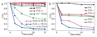 In summary, a highly efficient FeS1.92 based heterogeneous Fenton catalyst was synthesized by a facile ball milling of FeS with S powder. In the mechanochemical reaction, the S species can reduce Fe3++ to Fe2+ for Fenton-like reaction. At the same time, this FeS1.92 Fenton catalyst shows a highly sulfide resistance and improved performance for degrading sulfidecontaining organic pollutants. This work has broadened the application of FeSx based environmental catalyst in wastewater treatment, especially for sulfide-containing organic pollutants water.