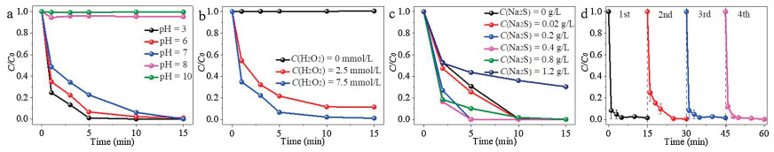 Figure 3 Effects of pH values (a), H2O2 concentrations (b), Na2S concentrations (c) on BPA removal efficiency. Cyclic stability of FeS1.92/H2O2 system for BPA degradation (d). Reaction conditions: [catalyst] = 0.25 g/L, [BPA] = 100 mg/L, [H2O2] = 7.5 mmol/L for a, c and d, [Na2S] = 0.2 g/L for a, b and d, pH 6.0 for b, c and d.