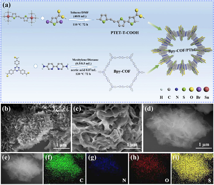 • Figure 1  (a) Synthesis process of Bpy-COF/PThC heterojunction. Scanning electron microscopy (SEM) images of (b) Bpy-COF, (c) PThC and (d) 30% Bpy-COF/PThC. (e-i) Mapping images of 30% Bpy-COF/PThC.