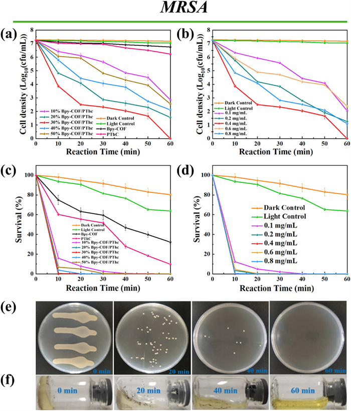 Figure 3.  The effects of different proportions of Bpy-COF/PThC on (a) cell density and (b) bacterial survival rate of MRSA. The effects of different concentrations of 30% Bpy-COF/PThC on (c) cell density and (d) bacterial survival rate of MRSA. Photos of (e) MRSA colonies on agar plates and (f) rabbit plasma flow after treatment with 30% Bpy-COF/PThC (0.4 mg/mL) under visible light.