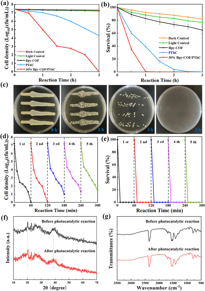 Figure 4.  Effects of 30% Bpy-COF/PThC (0.4 mg/mL) on (a) cell density and (b) bacterial survival rate of MRSA under natural light. (c) Photos of MRSA colonies at different reaction times. (d) Cell density and (e) survival rate curves of MRSA after five cycles of inactivation by 30% Bpy-COF/PThC. (f) XRD and (g) FT-IR spectra of 30% Bpy-COF/PThC before and after photocatalytic reaction.