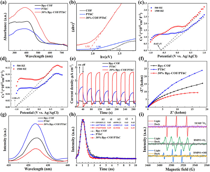 Figure 8  (a) UV–vis spectra and (b) bandgap diagrams of Bpy-COF, PThC, and 30% Bpy-COF/PThC. Mott-Schottky curves of (c) Bpy-COF and (d) PThC. (e) Photocurrent response. (f) Electrochemical impedance spectroscopy (EIS) impedance. (g) Photoluminescence (PL) spectra. (h) Time-resolved photoluminescence (TRPL) spectra. (i) Electron spin resonance (ESR) spectra.