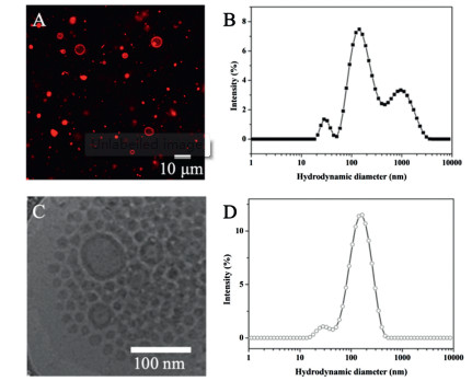Figure 3 (A) CLSM image and (B) DLS distribution curve of giant polymersomes EM2 from double emulsion; (C) Cryo-EM image and (D) DLS distribution curve of the EM2 self-assemblies obtained using double emulsion method followed by extrusion treatment. In CLSM image, Nile Red was loaded in the membrane for visualization.