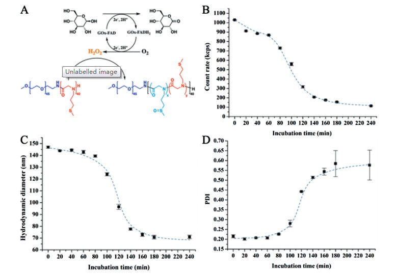 Figure 4 (A) Schematic illustration of the GOx-catalyzed conversion of D-glucose into gluconolactone with production of H2O2, transferring the pendant hydrophobic thioether groups of EM2 into hydrophilic sulfoxides; the evolution of (B) count rates, (C) hydrodynamic diameter (Z-average diameter) and (D) size distribution (PDI) of GOx-loaded EM2 polymersomes (0.5 mg copolymer, 0.5 mg GOx in 1 mL PBS) as a function of time of incubation with 25 mmol/L glucose at 37 ℃.