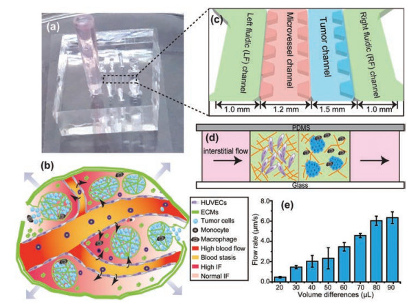 Figure 1 Reconstruction of 3D breast tumor microenvironment in the presence of IF on a microfluidic device. (a) An image of the microfluidic device. (b) Schematic of breast tumor microenvironment. (c) and (d) Schematic of the device to mimic natural 3D breast tumor microenvironment, containing breast tumor aggregates, U937 cells, and HUVECs in separate channels with the existence of IF. (e) Relationship between hydrostatic pressure gradient and IF rate.
