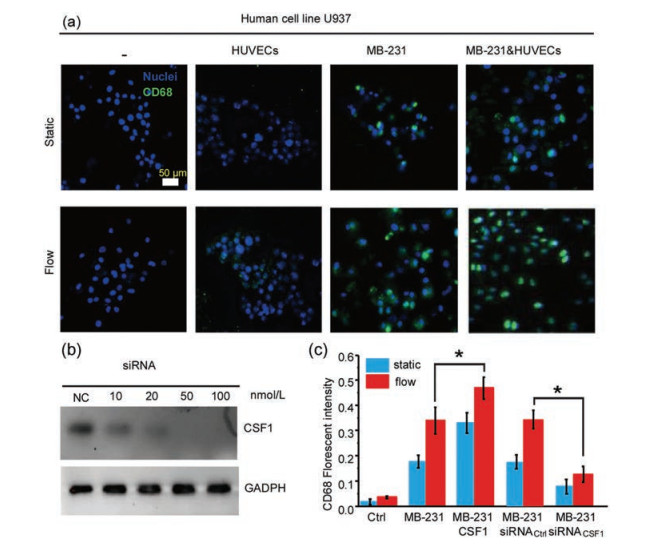 Figure 2 Macrophages activation on the microfluidic device. (a) On-chip fluorescent CD68/DAPI staining of U937 when co-cultured with HUVECs or MDA-MB-231 separately or tri-culture with both cells under static and IF conditions. Scale bar: 50 μm. (b) RT-PCR analysis of colony-stimulating factor (CSF1) excretion from MDA-MB-231 cancer cells transfected with different concentration of specific siRNAs. (c) Influence of CSF1 on the activation of macrophages under different culture conditions, which were evaluated by CD68 staining.