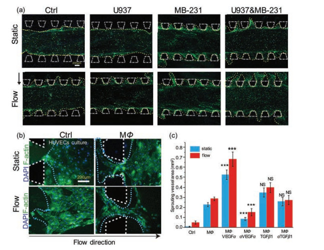 Figure 3 Effects of macrophages and IF on tumor angiogenesis. (a) The fluorescence images of HUVECs sprouting under different culture systems. HUVECs stained with DIO were co-cultured with U937 or MDA-MB-231 separately or tri-cultured with both cells on the microfluidic platform for 3 days, respectively. Scale bar: 200 μm. (b) The immunofluorescence images of HUVECs sprouting in 3D collagen matrix in the presence of IF and the macrophages (MΦ). Scale bars: 200 mm. (c) The endothelial microvessel area in the central channel after 3 days cultured with indicated experimental conditions (Bars represent mean ± S.E.M. from at least 3 devices per condition. *** P < 0.001, NS: no sense). αTGFβ1 and αVEGFα stand for anti-TGFβ1 and anti-VEGFα neutralizing antibody.