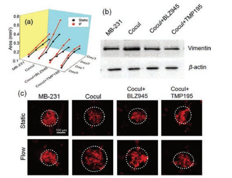 Figure 4 Effects of macrophages and IF on breast tumor aggregates dispersion and invasion. (a) Quantitative measurement of aggregate dispersion from 0 to 3 days under different culture conditions. (b) Western blotting analysis of vimentin level under different culture conditions with or without drug treatment. β-actin was used as loading control. (c) Corresponding fluorescence images of MDA-MB-231 cell dissemination in the 3D collagen gel. Cocul: co-culture.