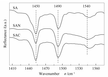 催化剂载体表面主要存在两种类型的酸:B酸(提供质子)和L酸(接受电子)。吡啶在不同类型酸上反应出现的红外特征峰位置不同, 波数1540 cm-1处的吸附带为B酸中心与吡啶分子的作用生成的配合物的振动谱带, 波数1450 cm-1处的吸附带为L酸中心与吡啶分子的作用生成的配合物的振动谱带, 在波数1490 cm-1处的吸附带为B酸中心和L酸中心共同作用的结果[14]。
