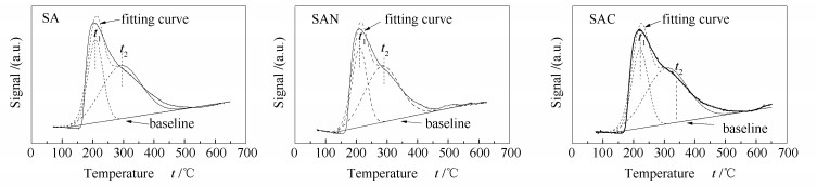 Sample Specific surface area A/(m2·g-1) Pore volume v/(mL·g-1) BET micropore mesoporous total micropore mesoporous SA 167 82 85 0.25 0.03 0.22 SAN 211 125 86 0.29 0.05 0.24 SAC 190 96 94 0.44 0.04 0.40 2.1.2 改性前后的酸性质分析