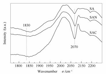 改性前后的Pt/SAPO-11催化剂的一氧化碳红外光谱谱图见图 3。由图 3可知, 改性前后Pt/SAPO-11催化剂CO的吸附谱峰基本类似, 均有中心位于1830 cm-1的桥式吸附峰及2070 cm-1的线式吸附峰[17-19], 改性后的催化剂SAN和SAC在2070 cm-1的吸附峰较催化剂SA均增强, 即SAC一氧化碳线式吸附峰峰强大于SAN。以上实验结果表明, 炭黑改性和柠檬酸改性均使Pt在催化剂上的分散度有所提高[20, 21]。