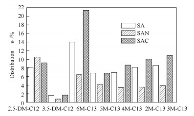 为了比较催化剂的不同改性方法对临氢异构化反应异构化产物分布的影响, 设计了反应温度为320 ℃, 反应压力为2.0 MPa, 空速为1.0 h-1, 氢油体积比为500条件下的模型化合物正十四烷在改性前后催化剂上临氢转化反应, 图 4为改性前后催化剂对异构化产物分布的比较。由图 4可知, 改性前后的临氢转化的产物类型相同, 均以单甲基异构体(6M-C13、5M-C13、4M-C13、2M-C13、3M-C13)为主, 存在少量的双支链烷烃(2, 5-DM-C12、3, 5-DM-C12), 产物类型分布规律呈现出明显的单甲基支链异构体优势。柠檬酸改性的催化剂SAN其目标异构化产物总量减少, 其中, 单甲基异构化产物减少而双甲基异构化产物(2, 5-DM-C12)略有增多; 炭黑改性的催化剂SAC其目标异构化产物总量增多, 其中, 单双甲基异构化产物均有所增多且支链位于碳链中心的单甲基异构化产物(6M-C13)显著增多。