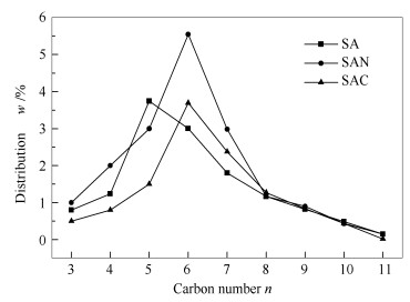 由于SAPO-11分子筛的孔道限制, 未改性的催化剂SA裂化产物以C5为主, 而柠檬酸(SAN)和炭黑(SAC)改性的催化剂裂化产物以C6为主, SAC的裂化产物总量较SA不变, SAN裂化产物总量较SA增多, 说明柠檬酸和炭黑改性扩大了催化剂孔道, 生成更多比C5分子量大的裂化产物C6。
