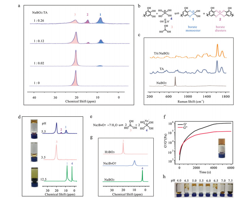 Figure 2 Gelation and degradation mechanisms of the TA/borates hydrogels. (a) Solution 11B NMR spectra of TA/NaBO2 mixtures. The TA to NaBO2 molar ratios were ranged from 0:1 to 0.26:1 in D2O fixed at pH 5.5. (b) The formation of catechol-borate monoesters and diesters between TA and NaBO2. (c) Raman spectra of TA, NaBO2, and TA/NaBO2 hydrogels. (d) 11B NMR spectra of TA/NaBO2 in D2O at a molar ratio of 1:0.12 at different pH conditions. (e) The hydrolysis of Na2B4O7 in aqueous solution. (f) Time-dependent rheology of the TA/Na2B4O7 hydrogel (Gel 2). (g) 11B NMR spectra of NaBO2, Na2B4O7, H3BO3 in D2O. (h) TA/Na2B4O7 mixtures at various pH conditions.