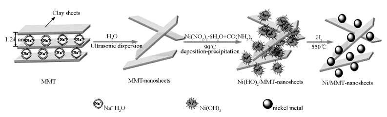 The procedure for the synthesis of nanosheets of Ni/MMT is illustrated in Figure 1. After the aqueous suspension of the exfoliated MMT nanosheets (denoted as MMT-nanosheets) were obtained by dispersing the pristine MMT in water with assistance of ultrasonic, nickel nitrate and urea were added into the suspension, followed by ultrasonic for another hour. Nickel hydroxides deposited on the exfoliated MMT nanosheets (denoted as Ni(OH)2/MMT-nanosheets) were obtained by the deposition-precipitation method as the suspension reacted at 90 ℃ for several hours (such as 4 h) in a hydrothermal autoclave reactor with stirring. The suspension of Ni(OH)2/MMT-nanosheets was separated by centrifugation, washed with water and dried. Finally, the nanosheets of Ni/MMT catalyst (denoted as Ni/MMT-nanosheets) were obtained by simple reduction of Ni(OH)2/MMT-nanosheets at 550 ℃ in H2. Nickel loading of Ni/MMT-nanosheets was depended on the reaction time of the deposition-precipitation. For comparison, two nickel supported on MMT catalysts were prepared with the custom impregnation method, in which one was obtained from the suspension of the layered MMT (dispersed in water by stirring) and denoted as Ni/MMT, and the another was obtained from the suspension of the MMT-nanosheets (dispersed in water with assistance of ultrasonic) and denoted as Ni/MMT-ultrasonic.
