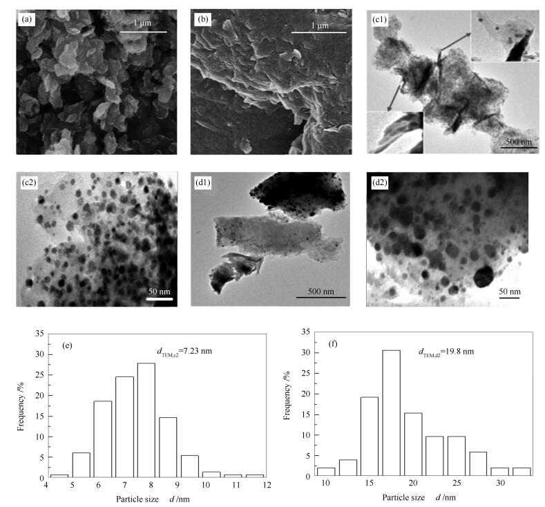 Nanosheets of Ni/Clay catalyst were prepared by a deposition-precipitation method with nickel nitrate, urea and montmorillonite (MMT). Na-MMT (Zhejiang Sanding Group Co., Ltd.) was used directly without further purification. 0.5 g Na-MMT was dissolved in 100 mL H2O and dispersed with assistance of ultrasonic for 4 h. 7 g Ni(NO3)2·6H2O and 4 g urea were added into the suspension and dispersed with assistance of ultrasonic for another hour. Then the suspension reacted at 90 ℃ for several hours (such as 4 h) in a 100 mL hydrothermal autoclave reactor with teflon chamber by stirring. The suspension was separated by centrifugation, washed with water and dried at 100 ℃ overnight. Finally, the dried samples were reduced at 550 ℃ in H2 flow of 30 mL/min for 4 h and passivated in a nitrogen-diluted oxygen (1.0% O2) gas stream at room temperature for 3 h to obtain the nanosheets of Ni/MMT catalyst (denoted as Ni/MMT-nanosheets). Nickel loading of Ni/MMT-nanosheets was depended on the reaction time of the deposition-precipitation. For comparison, two nickel supported on MMT catalysts with 10.0% nickel loading were prepared with the custom impregnation method, in which one was obtained from the suspension of the layered MMT (dispersed in water by stirring) and denoted as Ni/MMT, and another was obtained from the suspension of the MMT-nanosheets (dispersed in water with assistance of ultrasonic) and denoted as Ni/MMT-Ultrasonic. The actual nickel loading on each catalyst was determined by flame atomic absorption spectroscopy (TAS-990F, Beijing Purkinje General Instrument Co., Ltd.).