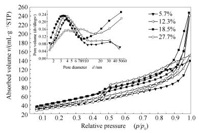 Catalyst Ni w/% BET surface area A/(m2·g-1) Pore volume v/(cm3·g-1) Pore diameter d/nm Ni/MMT-nanosheet 5.7 128 0.22 6.6 12.3 144 0.23 6.5 18.5 168 0.38 9.1 27.7 125 0.37 11.9 -