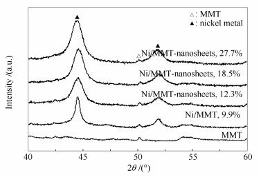 Catalyst Ni w/% BET surface area A/(m2·g-1) Pore volume v/(cm3·g-1) Pore diameter d/nm Ni/MMT-nanosheet 5.7 128 0.22 6.6 12.3 144 0.23 6.5 18.5 168 0.38 9.1 27.7 125 0.37 11.9 The XRD patterns of Ni/MMT-nanosheets with different nickel loading show that the widths of the characteristic peaks of nickel metal at half are almost the same (Figure 6), indicating the dispersion of the catalyst is little influenced with increasing Ni loading, which can be attributed to the promotion of the deposition-precipitation method itself on the dispersion of the catalyst[15]. As a result, TOF of Ni/MMT-nanosheets is increased with nickel loading and reaches the max value (169.8) as Ni loading being 18.5%, which is improved about 19 times than that of Ni/MMT. Then, TOF decreases greatly as Ni loading increases to 27.7%. Therefore, due to its special 2D structure with the nanosheets of Ni/MMT, Ni/MMT-nanosheets exhibits the excellent hydrogenation activity even Ni loading being high to 18.5%.
