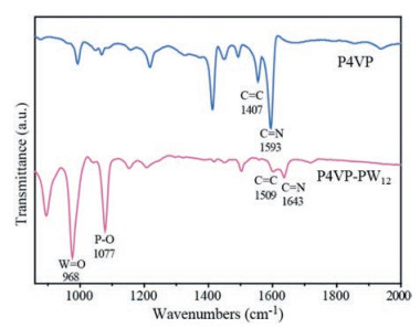 Poly(4-vinylpyridine) (P4VP) was chosen as supports for the immobilization of POM. The preparation of P4VP brushes is outlined in Scheme 1. P4VP brushes were prepared by self-initiated photografting and photopolymerization (SIPGP) from a selfassembled monolayers (SAMs) of α, ω-aminopropyltrimethoxysilane (APTMS) under UV-light irradiation (λmax = 350 nm). After the polymerization, the substrate was cleaned by ultrasound in several solvents with different polarities to ensure that only chemically grafted polymer remains on the substrate. The formation of P4VP brushes is evident that the strong bands at 1593 cm-1 and 1407 cm-1 are originated from the C = N and C = C stretching modes in P4VP (Fig. 1). AFM measurements show that the average height of P4VP brushes is 250 nm after 40 h of UV irradiation, and the P4VP grafted substrate appears to be homogeneous and smooth (Fig. 2A).