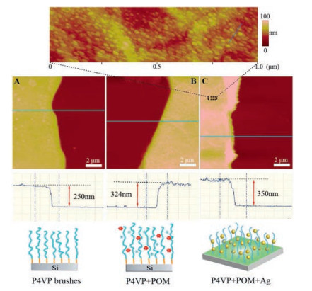 In conclusion, we have successfully incorporated POM in the P4VP brushes through static interaction. After the photoreduction to blue POM, the brush-POM hybrid showed excellent photoreductable capabilities to reduce Ag+ ions to Ag nanoparticles. In the present work, polymer brushes ensure a well dispersion of POM in the brush layer, thus enabling the controlled synthesis of Ag nanoparticles.
