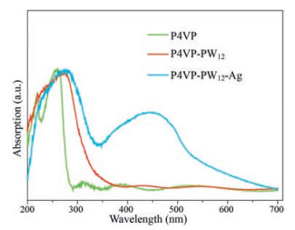 UV-vis absorption spectroscopy was used to monitor the process from the loading of PW12 and the formation of Ag nanoparticles. As shown in Fig. 3, the strong absorption bands at 218 nm and 259 nm are typical for P4VP. After the immobilization of POMs, a single band centered at 275 nm appeared, indicating the successful introduction of PW12 into the polymer layer. UV irradiation caused the reduction of PW12, giving blue PW12. The formation of Ag nanoparticles revealed an absorption band at 429 nm, characteristic for the surface plasmon absorption of the immobilized Ag nanoparticles.