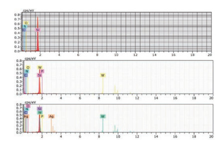 To further prove the successful incorporation of PW12 and presence of Ag nanoparticles on the P4VP brushes, energy dispersive X-ray (EDX) analysis of the samples were investigated. As shown in Fig. 4, the appearance of P and W signals and the successive occurrence of Ag signals at the characteristic binding energies in the wide-scan spectra confirm the presence PW12 and Ag nanoparticles on P4VP brushes.