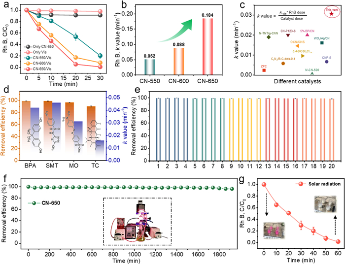 Figure 2  (a) Degradation curves of RhB under different systems. (b) Rate constants of RhB degradation by various CN photocatalysts. (c) Comparison of rate constants for RhB degradation by different photocatalysts. (d) Performance of the CN-650/Air/Vis system for the removal of various pollutants. (e) Reusability test of CN-650/Air/Vis system. (f) Continuous-flow experiments mediated by CN-650, with an inset showing a homemade continuous-flow device. (g) Experiments on the removal of RhB by CN-650 under natural sunlight irradiation. Reaction conditions: Catalyst dosage = 0.6 g/L, [RhB] = [BPA] = [SMT] = [MO] = [TC] = 10 mg/L, pH 5, solar photodensity = 67.3 mW/cm2, photocatalyst loading capacity = 0.1 g, and flow velocity = 1.5 mL/min.