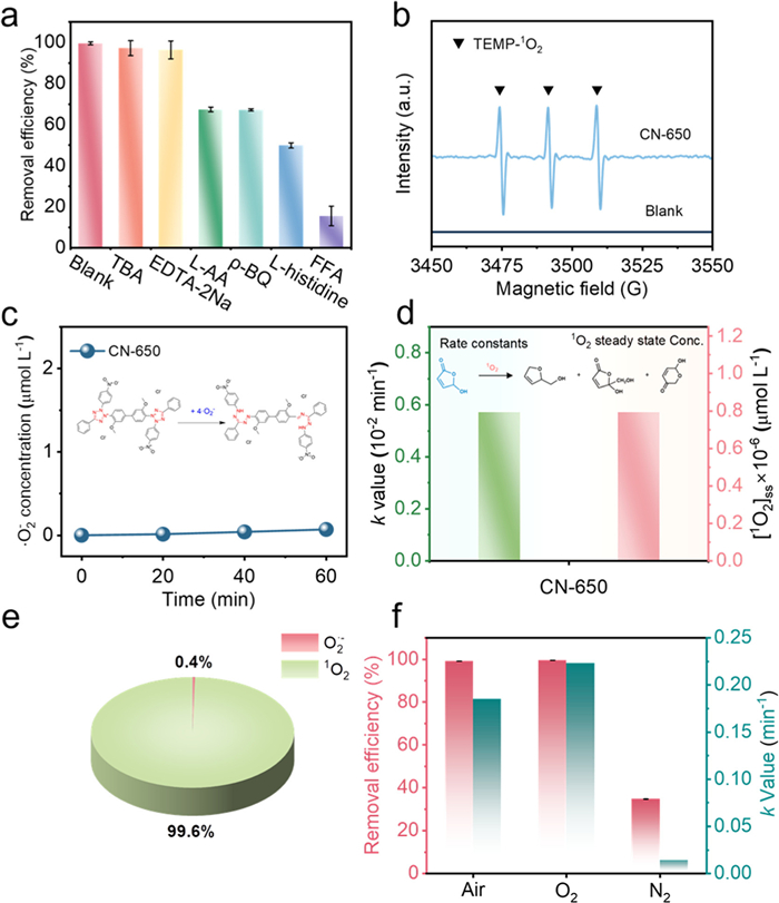 Figure 3  (a) Efficiency of RhB degradation after the addition of different scavengers. (b) EPR spectra of TEMP-1O2 adducts. (c) Quantitative detection of O2•− in 650/Air/Vis system. (d) Kinetic rate constants of FFA and the corresponding steady-state 1O2 concentrations for 650/Air/Vis system. (e) Contribution of the two ROS in the 650/Air/Vis system. (f) Efficiency and kinetic constants of RhB degradation for CN-650 under different atmospheric conditions. Reaction conditions: [catalyst dosage] = 0.6 g/L; [RhB] = 10 mg/L; [TBA] = 500 mmol/L; [EDTA-2Na] = 10 mmol/L; [L-AA] = 10 mmol/L; [FFA] = [L-histidine] = 5 mmol/L; [p-BQ] = 2 mmol/L.