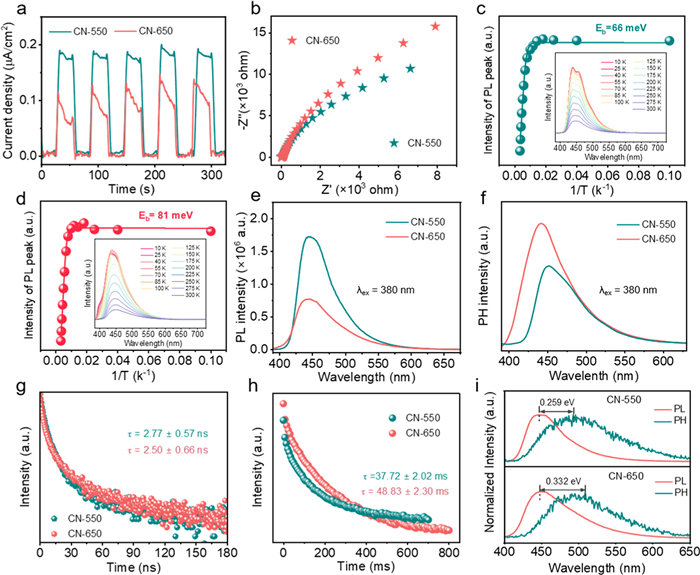 Figure 4  (a) Transient photocurrent response curve and (b) EIS Nyquist plots for CN-X. The intensities of integrated photoluminescence (PL) emission peak as a function of 1/T for CN-550 (c) and CN-650 (d). Insert: temperature-dependent emission spectra. (e) Steady-state PL and (f) phosphorescence (pH) spectra of CN-X. (g) The spectra of time-resolved PL (TR-PL) and (h) time-resolved pH (TR-pH) of CN-X. (i) Normalized PL and pH spectra of CN-X at 300 K.