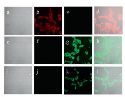 Figure 4 Cell images of HeLa cells. Top row: Cells incubated with probe NClO (5.0 μmol/L) for 30 min at 37 ℃. Middle row: Cells pretreated with probe NClO (5.0 μmol/L) for 30 min at 37 ℃ and then incubated with HClO (110 μmol/L) for another 30 min. Bottom row: Cells pretreated with PMA (1 μg/mL) for 2 h and then incubated with probe NClO (5.0 μmol/L) for 30 min at 37 ℃. (a, e, i) bright-field; (b, f, j) fluorescence from red channel; (c, g, k) fluorescence from green channel; (d, h, l) merged. Cells were magnified 40 times.