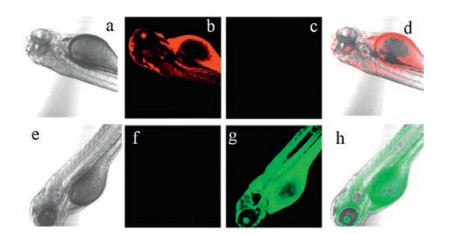 Figure 5. Images of zebra fish. Top row: Zebra fish incubated with probe NClO (5.0 μmol/L). Bottom row: Zebra fish treated with probe NClO (5.0 μmol/L) and subsequently incubated with HClO (110 μmol/L). (a, e) bright-field; (b, f) fluorescence from red channel; (c, g) fluorescence from green channel; (d, h) merged.In conclusion, we developed a fluorescent probe NClO for the qualitative and quantitative detection of HClO with high sensitivity and selectivity in a ratiometric manner. This probe exhibited a quick response towards HClO with a low detection limit (19 nmol/L). It is noteworthy that probe NClO could image exogenous and endogenous HClO in living cells and zebra fish with good performance.