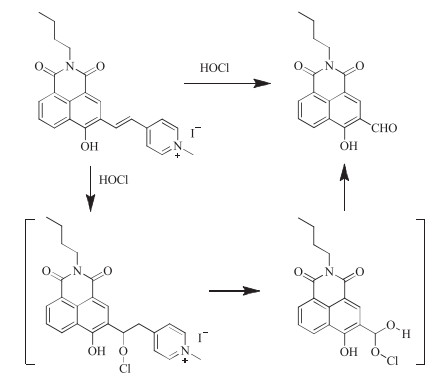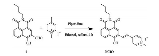 Naphthalimide-based fluorescent probes have been developed due to their advantageous optical properties and easy preparation [27-31]. In this work, we developed a red-emitting fluorescent probe, NClO, for the detection of hypochlorous acid (Scheme 1) with a large Stokes shift based on a naphthalimide derivative. The double bond between naphthalimide and methylated pyridine in probe NClO could be oxidized by hypochlorous acid, which would induce a blue shift of emission to display a ratiometric fluorescence change (Scheme 2). The fluorescence behavior of this probe in response to hypochlorous acid in the solution and in living cells suggested that probe NClO could detect hypochlorous acid with high sensitivity and selectivity in vitro and in vivo. The synthetic route of NClO was illustrated in Scheme 1.