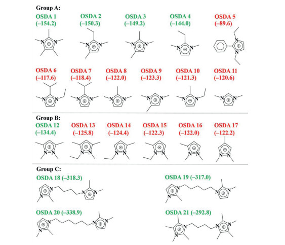 Figure 1. 21 experimental OSDAs and their calculated non-bonding host-guest interaction energies with the framework of STW (kcal (mol OSDA) -1). Successful and unsuccessful OSDAs for STW synthesis are shown in green and red, respectively.All calculations were performed using BIOVIA Materials Studio package [32]. The initial structure model of STW (space group P6122) was taken from literature [25] and refined as a pure-silica polymorph using the CVFF force field [33]. The 21 alkylated imidazolium and pyrazolium OSDAs involved in this study can be divided into three groups, including monoquaternary imidazo-lium-based cations (Group A), monoquaternary pyrazolium-based cations (Group B), and diquaternary imidazolium-based cations (Group C). Every OSDA cation was first optimized by DFT calculations with the generalized gradient approximation and the PBE functional [34]. Mülliken atomic charges and the dipole moments were calculated after DFT optimization [35]. Then, OSDA cations were manually put into the helical channels of STW. We tried several locations and orientations for each OSDA cation and kept the ones giving the best total energies after further geometry optimization. Finally, we performed simulated annealing molecu-lar dynamics simulations. The annealing temperature ranged from 300 K to 1000 K with an increment of 10 K. 1.0 fs of molecular dynamic simulations were performed in every heating-cooling cycle, and every cycle was repeated for 10 times. The locations and conformations of all OSDAs were further optimized at the end of each cycle. For each OSDA, we chose the cycle giving the best total energy to calculate the host-guest interaction energy Einter, according to the following formula: