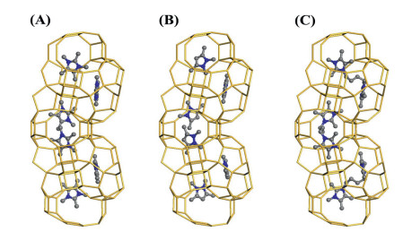 Figure 2 Distribution of (A) 1, 2, 3, 4, 5-pentamethylimidazolium cation (OSDA 1 in Group A), (B) 1, 2, 3, 5-tetramethylpyrazolium cation (OSDA 12 in Group B), and (C) (butane-1, 4-diyl)bis(2, 3, 4, 5-tetramethylimidazolium) (OSDA 21 in Group C) within the channels of STW. Si, C, and N atoms are shown as yellow, grey, and blue, respectively. O and H atoms are omitted for clarity.