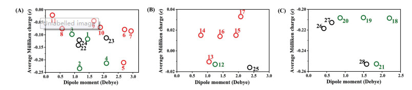 Group B consists of six monoquaternary pyrazolium-based OSDA cations (OSDAs 12 to 17, Fig. 1). The strongest host-guest interactions occur when each stw cavity is occupied by one OSDA cation (Fig. 2B). 1, 2, 3, 5-Tetramethylpyrazolium (OSDA 12) exhibits the strongest host-guest interaction with STW, which is the only successful OSDA in Group B that can direct the formation of STW in experiment. 1-Ethyl-2, 3-dimethylpyrazolium (OSDA 14) and 1-ethyl-2, 5-dimethylpyrazolium cations (OSDA 15) are isomers of OSDA 12, but they could not direct the formation of STW. This is due to the differences in not only their shapes but also the atomic charge distribution in these cations. The average Mülliken charge on nitrogen atoms in OSDA 12 is -0.013 e, which is more negative than those on other OSDAs in Group B (Fig. 3B). This agrees well with the OSDAs in Group A, where cations with more negative charges on nitrogen atoms are better OSDAs for STW.