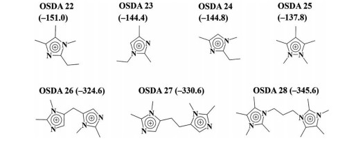 Group C consists of four diquaternary imidazolium-based cations that have been used to synthesize STW-type zeolites. In our study, this is the only group whose members are all able to direct the formation of STW in experiment without producing other types of zeolites as side products. The strongest host-guest interactions occur when three OSDA cations are loaded into each unit cell of STW and each OSDA cation rides across two adjacent stw cavities. These cations are stacked in a helical way matching the helical channels of STW and the angles between the planes of the two imidazolium rings in these cations are close to 60, which approximately equals the angles between two adjacent stw cavities (Fig. 2C). From OSDAs 18 to 20, the two imidazolium rings are linked by four, five, and six methylene groups, and the corresponding host-guest interactions decrease with the lengths of the linkers (-318.3, -317.0 and -292.8 kcal (mol OSDA) -1, respectively). This result agrees well with the report by Camblor and co-workers [33]. (Butane-1, 4-diyl)bis(2, 3, 4, 5-tetramethylimi-dazolium) (OSDA 21), which consists of four more methyl groups attached to the imidazolium rings than OSDA 18, exhibits a host-guest interaction stronger than all the others, indicating the importance of the match in size between OSDAs and zeolite channels.