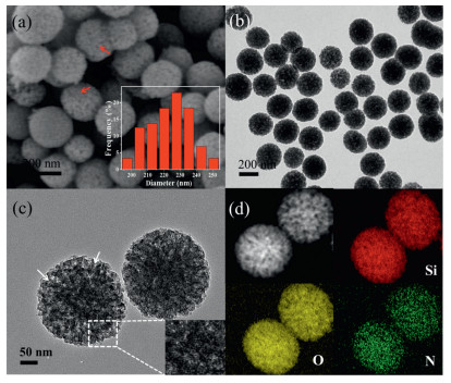 Figure 1. (a) SEM image (inset is the particle size distribution of MSNs), (b) TEM image, (c) HRTEM image (inset is the magnification of the white square area), and (d) STEM image of the typical MSNs product and the corresponding elemental mappings of Si, O, N.Fig. 2 illustrates the N2 adsorption-desorption isotherms and corresponding pore size distribution curves of MSNs products. As depicted in Fig. 2a, MSNs exhibit a typical type Ⅳ isotherm at the relatively high pressure, which is a basic characteristic of mesoporous material [30]. It is worth mentioning that MSNs has a sharp peak at 3.99 nm and a wide peak in the range of 6–20 nm, indicating the multilevel pore structure (Fig. 2b). The surface area and pore volume of MSNs is about 133 m2/g and 0.37 cm3/g, respectively. After modification by PEI, the surface area and pore volume are drastically reduced among these samples, and the order is 60-PEI-MSNs < 50-PEI-MSNs < 30-PEI-MSNs < MSNs (Table S1 in Supporting information). The reduction in pore volume is mainly due to the filling of PEI, whereas the mesoporous structure remains preserved even after functionalization.