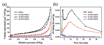 Interestingly, it is found that when the loading content of PEI is 30%, the peak at 3.99 nm disappears, and the average pore size increases to 10.06 nm. This phenomenon may be attributed to the reason that the PEI molecules easily diffuse into small pores of MSNs, thus causing the blockage of these small pores, whereas those large pores are well kept, as reported by previous work [31]. In this case, although the total pore volume decreases, the average pore size of modified MSNs increases (Fig. 2b). When more PEI molecules are loaded into the MSNs, these large pores are also fully blocked with the further reduction of the average pore size.