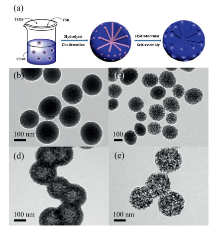 Fig. 3a descripts the synthetic procedure of MSNs. The fabrication is based on a modified Stöber method [35], which is derived from the co-hydrolysis of TEOS and TSD. While the involvement of TSD in the synthesis leads to the difference degree condensation of silica species, thus resulting in the formation of MSNs with hierarchical pore structure. At the absence of TSD, the obtained silica nanoparticles have a spherical morphology with about 180 nm (Fig. S3 in Supporting information). Moreover, the pore structure is single, which is totally different with the typical MSNs. Therefore, the induced TSD guides the pore structure of MSNs. Along with the hydrothermal treatment and self-assembly process, MSNs with hierarchical pore structures is obtained after removing the template.